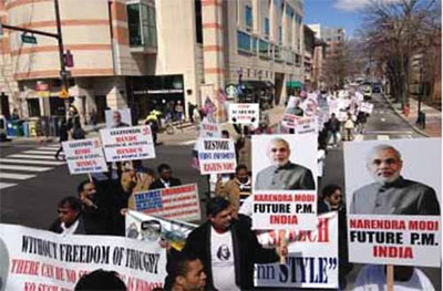 NEW YORK (TIP): About 200 Indian-Americans held a protest march in Pennsylvania against the withdrawal of an invitation to Gujarat Chief Minister Narendra Modi to speak at the Wharton India Economic Forum (WIEF). Under the banner of “Americans for Free Speech,” they raised slogans like “We want Modi” and displayed his pictures. Most of the protesters who had arrived from New York and New Jersey marched down several blocks to hold a demonstration in front of the WIEF event on Saturday.
