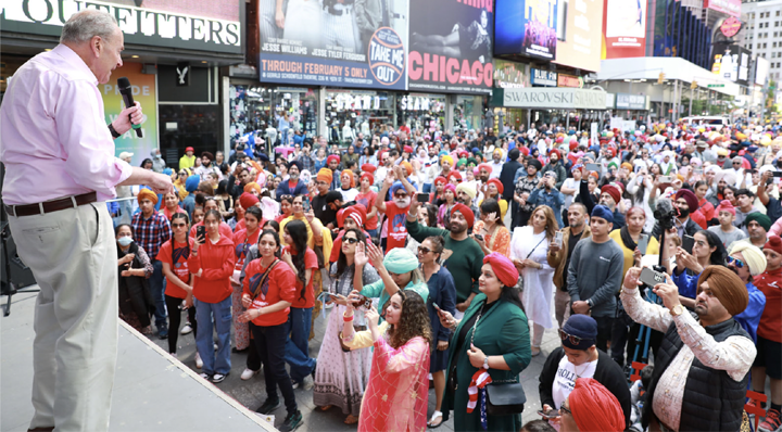 To support this event and Sikh community in America, Senator Chuck Schumer of New York took to the stage and shared his views on how Sikh community has always been an integral part of the American society “We love the Sikh community, and it is a beautiful community. We welcome you as New Yorker’s and as Americans. You work hard, you believe in family, you have a great faith, and you help build and create our great community” He mentioned about passing the Asian Anti Hate crime bill to prosecute any action of hate, bigotry, and violence. He showed his solidarity to the Sikh community by wearing the Turban and shook a leg to famous Punjabi music.