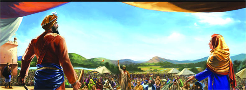 It was afternoon. Word went round that the Guru was in the marquee and he would be coming out soon to meet his Sikhs. All eyes were turned towards the tent and everyone was waiting patiently for Guru’s Darshan (appearance) and to receive his blessings. But it took a little longer than expected.