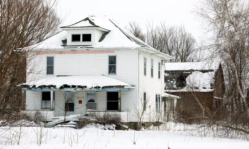 Now the land is rented out and is all given over to corn. A little further along, the Watts family’s farmhouse stands empty, its roof falling in. There are a few relics of the old farm at the place that used to be owned by the Williamses – an abandoned hen house and a bit of machinery – but the land is all corn and soya beans. The Denning house, on Walnut Avenue, was bulldozed after the land was sold and rolled into a bigger operation.