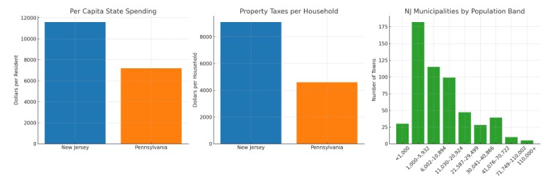 Despite being one-fifth the size, New Jersey spends like an empire. Trenton operates a larger budget than its bigger neighbor while delivering no better services — just more layers of officials.