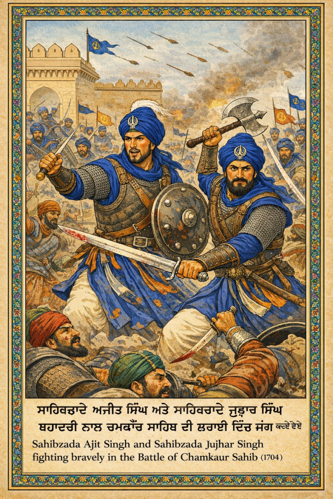 The most tragic and defining chapter of his life unfolded in December 1704, during the battle of Chamkaur Sahib. Vastly outnumbered by Mughal forces, Guru Gobind Singh took a decision that continues to challenge human comprehension. He sent his two elder sons—Sahibzada Ajit Singh and Sahibzada Jujhar Singh, both in their teens—into battle. They fought with extraordinary bravery and fell as martyrs. Their deaths were not acts of youthful recklessness, but conscious offerings to the cause of freedom and dignity.