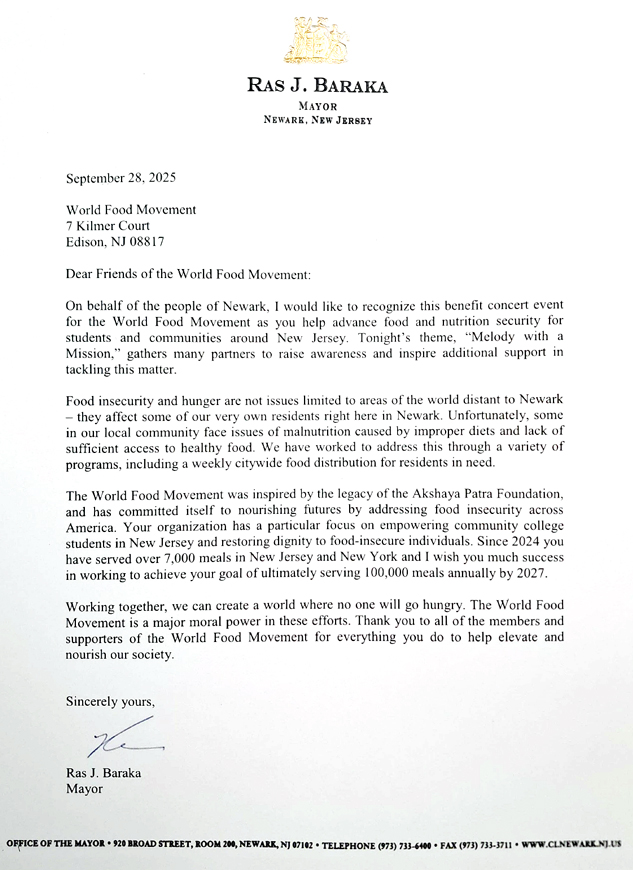 The Honorable Mayor of Newark Ras J. Baraka, awarded a citation on the occasion, congratulating the World Food Movement and said that the organization will be a major power to address food insecurity and empower students and communities.