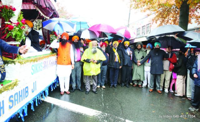 The Richmond Hill Parade to celebrate the birth anniversary of the First Master of the Sikhs, Shri Guru Nanak Dev Ji, was started by Gurdwara Makhan Shah Lobana in 2001. A rain soaked day greeted the devotees preparing to march in the 14th Guru Nanak Day Parade in Richmond Hill on November 1. Not to be deterred by the inclement weather, thousands of devotees of Guru Nanak, with umbrellas in their hands marched in the parade or stood by the streets to watch the parade.