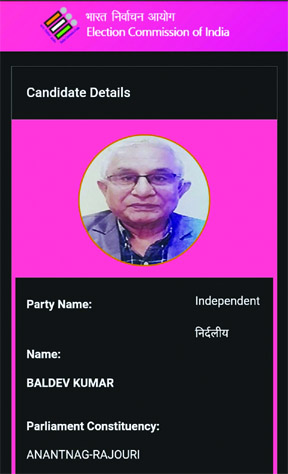 Srinagar (TIP)- Punjab resident Baldev Kumar has become the first person from outside Jammu and Kashmir to contest Lok Sabha polls in the Union Territory after the abrogation of Article 370 in 2019. Kumar (67), a resident of the Naya Gaon area of Mohali in Punjab, filed his nomination papers from the Anantnag-Rajouri Parliamentary constituency as an independent candidate on Friday.