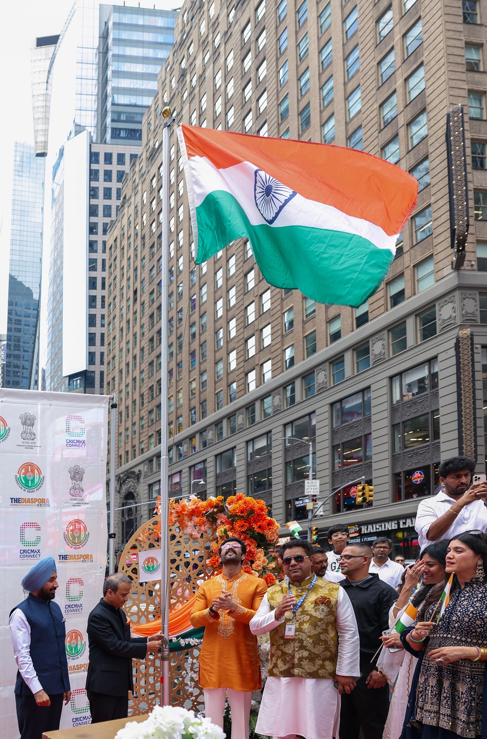 The ceremony’s centerpiece was the solemn hoisting of both the Indian National Flag, the Tiranga, and the American flag, accompanied by the playing of both national anthems, against the dazzling digital backdrop of Times Square – a powerful symbol of India’s journey, global stature, and the strong bond between the two nations.