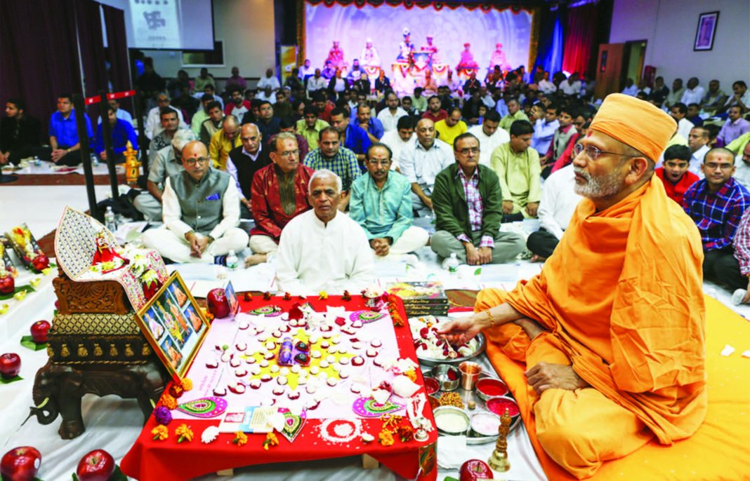 The large gathering at the temple listening to the sermon of Pujya Yagnavallabh Swami Ji Maharaj