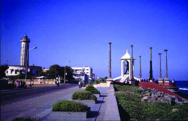 History lessons and political power play continue with two other major monuments on the promenade. The austere First World War memorial commemorates the combatants who died during WWI. Diagonally opposite the memorial, a few steps on, a larger-than-life statue of Gandhi occupies centre-stage on the promenade, surrounded by antique pillars brought from the ancient seaport of Arikamedu.