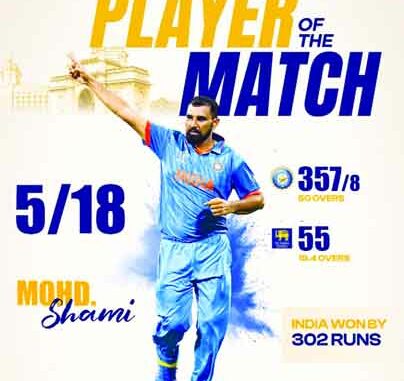 Mumbai (TIP)- Mohammed Shami and Mohammed Siraj intimidated and scarred an under-prepared Sri Lanka with a fast bowling exhibition for the ages as India demolished the islanders by a record 302 runs to enter the World Cup semifinals here on Thursday, November 2.