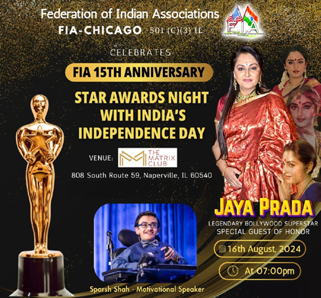Sunil Shah, Chairman and Founder, FIA, said about the exciting event: “In our continued tradition of honoring the Community Leaders who selflessly serve us, we have added more categories to the awards list. For the first time, we will have two award-winning international celebrities flying specifically for this FIA event to Chicago, Sparsh Shah and Bollywood Celebrity Jaya Prada.”
