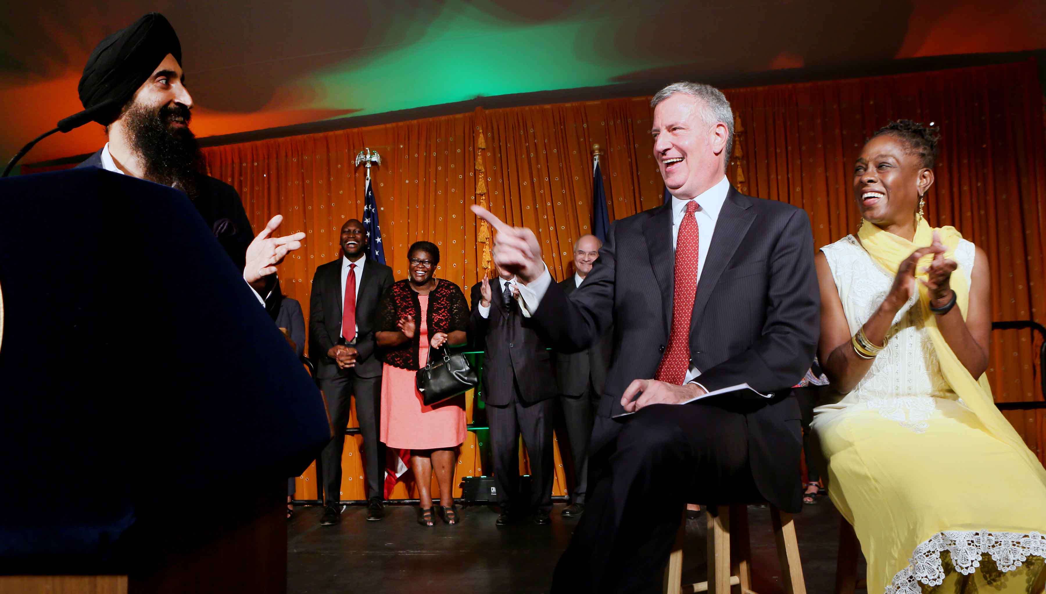 New York City Mayor Bill de Blasio and his wife Chirlane McCray (right), enjoy a lighter moment as Waris Ahluwalia (right), Actor, Designer, Model speak on the occasion of Diwali Celebration at Gracie Mansion, mayor’s official residence in New York.