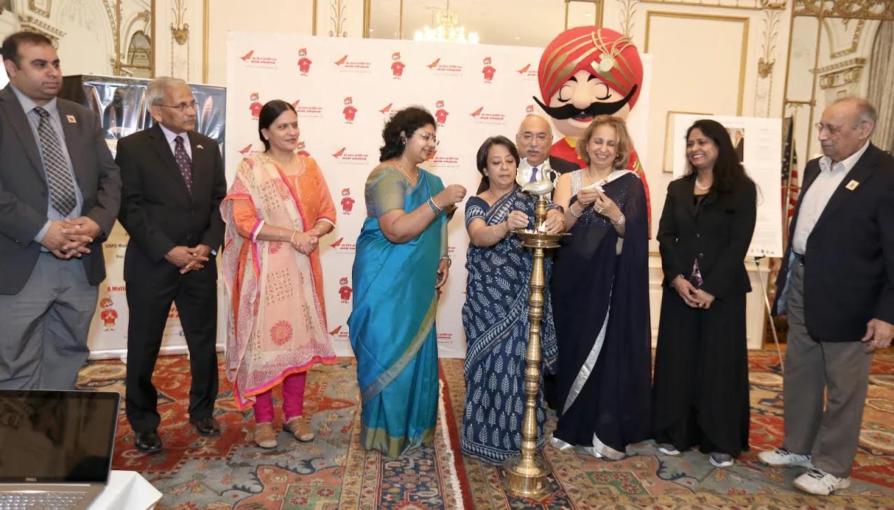 Lighting the lamp – Consul General Riva Ganguly Das lights the lamp. Also seen in the picture are Vandana Sharma, Air India Regional Manager and Diwali Stamp Project Chair Ranju Batra, with others