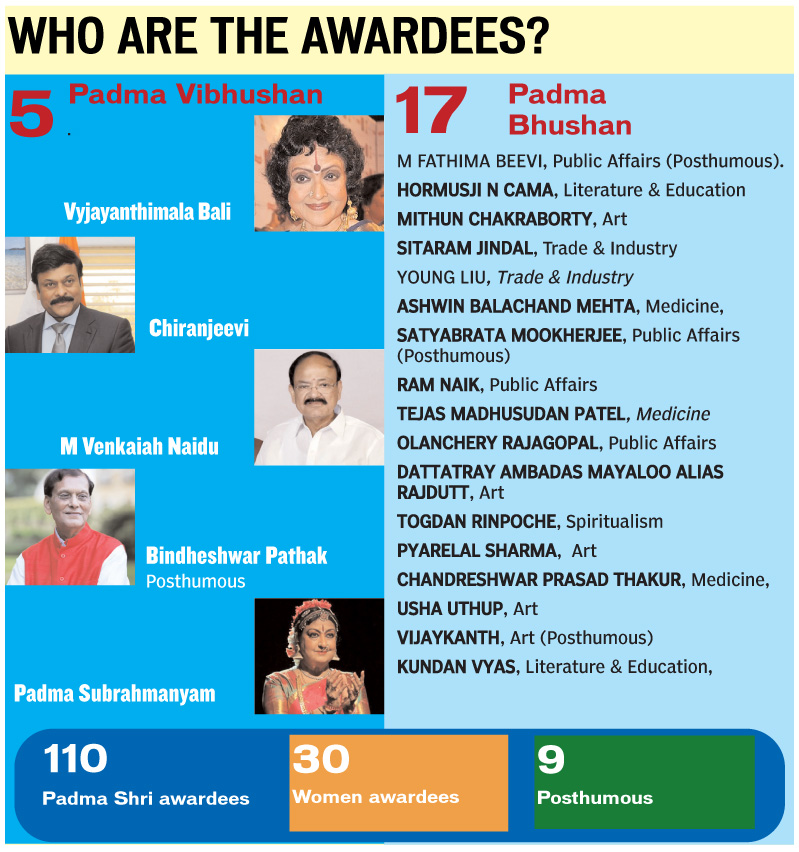 Top Padma honors for Venkaiah Naidu, Vyjayanthimala, Chiranjeevi